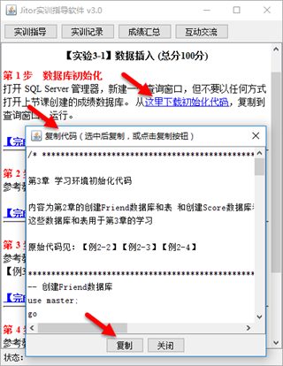 本书主页不再提供源代码文件的直接下载,而改由“Jitor 实训”在线下载和使用,下载的链接嵌入在每一个需要代码的实验中。 在每个实验的“第 1 步数据库初始化”中有一个下载链接,下载的源代码直接在一个窗口中显示,复制这些代码即可。界面如下图。