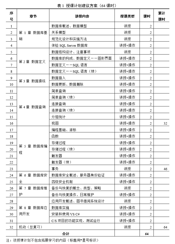 教学说明本书支持的版本包括2005/2008/2012/2014/2016,全书的屏幕截图是基于SQL Server 2016的,但是微课中与图形界面操作有关的部分,则分别为SQL Server 2005、SQL Server 2008、SQL Server 2012、SQL Server 2014和SQL Server 2016制作四个版本,以便读者根据自己安装的版本进行学习。本书所有代码在所有版本上测试运行通过,其中有些版本对有些功能不支持,在书中已经标出,不影响本书的学习。本书网站 http://sql.wxit.org/,所有在线资源将在这个网站上发布和更新。 本书适用于32、48、64和80课时的教学,64课时的授课计划见表1,配套的课程设计指导材料在每一章的最后一节,专用周的课时安排见表2。为满足高职本科学生的求知欲望,还加入了拓展学习的内容(标题用*星号标识),授课教师应该根据授课时数、教学大纲和生源情况进行调整,灵活安排。 ![]()